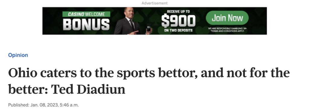 Ironically, media reports from Ohio about the threat of problem gambling, are peppered with advertisements to gamble, as per the following screenshot: